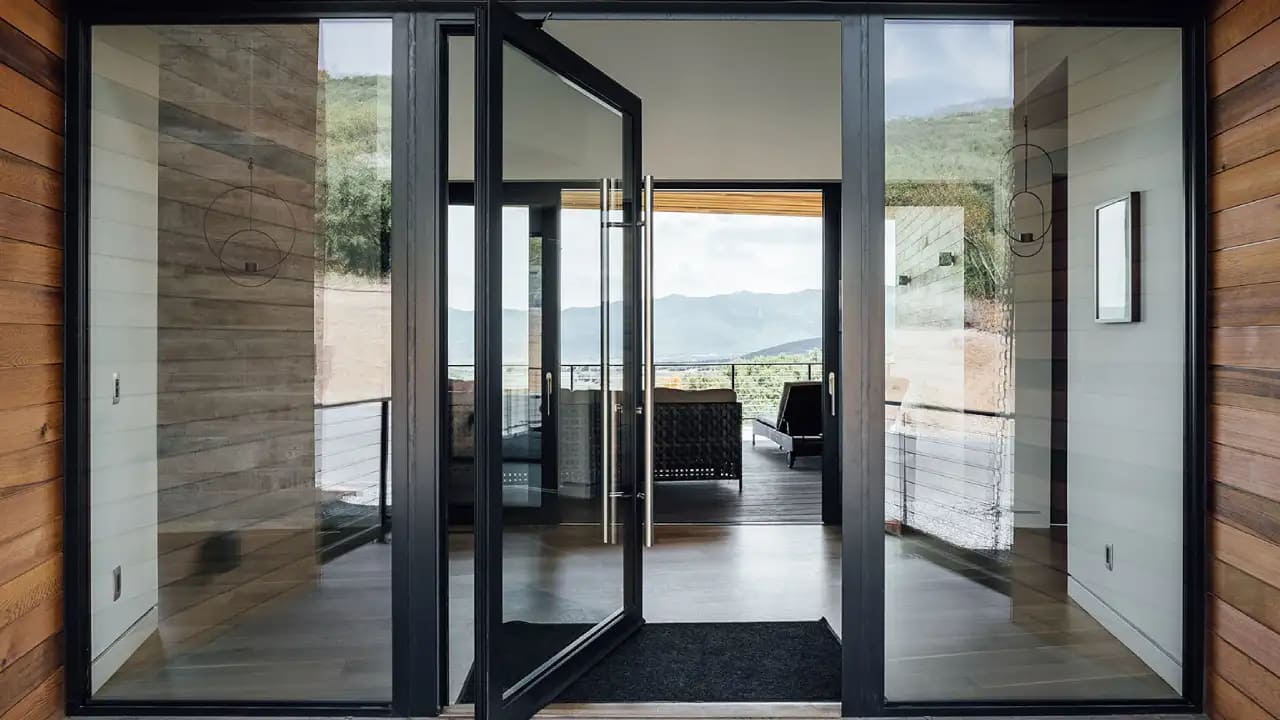 A durable and modern swing door made from high-quality aluminum material. The door is designed to provide a sleek and stylish entrance to any room or area.